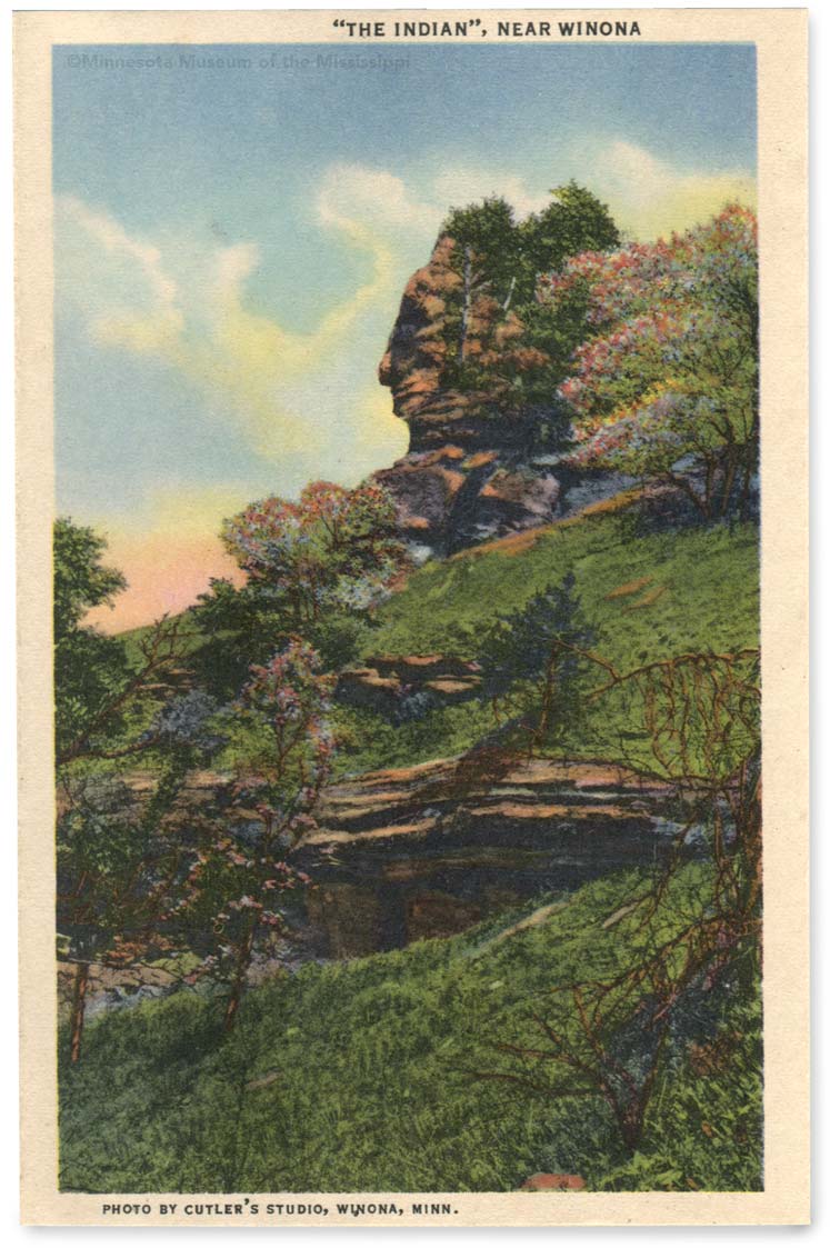 North of Winona, visible on northbound Highway 35 midway between Bluff Siding and Fountain City at top of cliff overlooking Mississippi River valley.