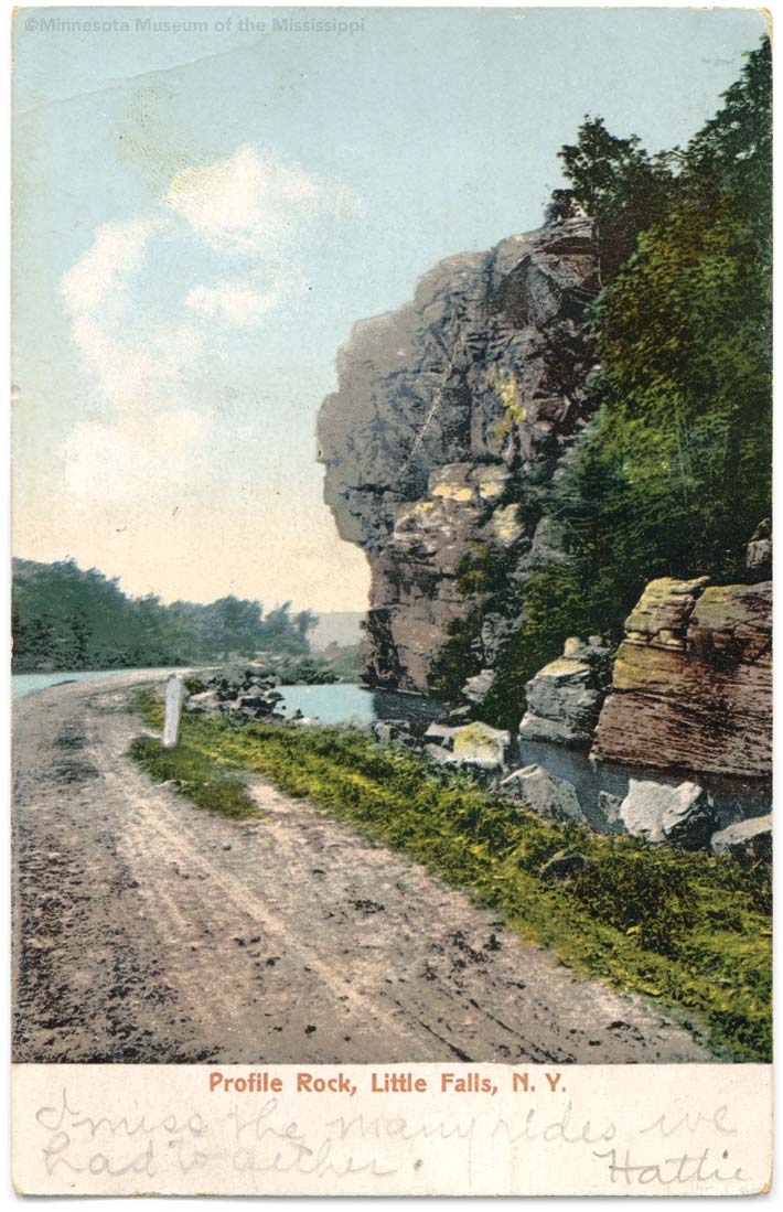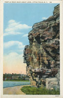 Obverse: Profile Rock, Little Falls, N.Y. Publisher: Rochester News Company MNM#01-01098 Located on banks of old Erie Canal. The rock face looks very different in postcards from the 1900s vs. postcards from the 1930s. Perhaps the profile was damaged during construction of Erie Canal Lock No. E-17 in 1911? Other views of this formation: |