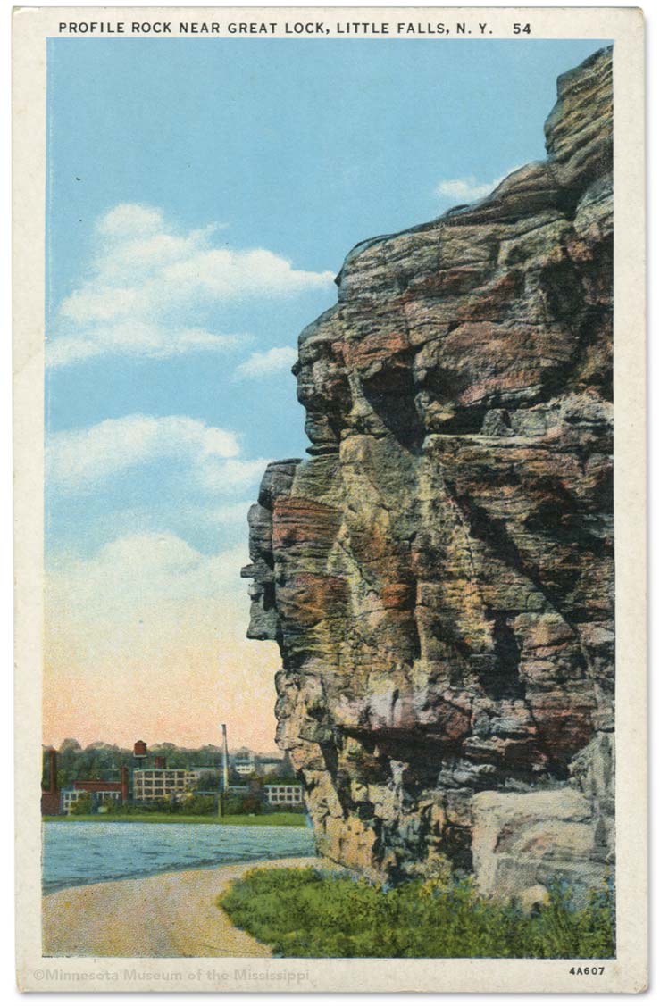 Obverse: Profile Rock Near Great Lock, Little Falls, N.Y. 54 Publisher: C.W. Hughes & Co. Inc., Mechanicville, N.Y. MNM#01-01197 Located on banks of old Erie Canal. The rock face looks very different in postcards from the 1900s vs. postcards from the 1930s. Perhaps the profile was damaged during construction of Erie Canal Lock No. E-17 in 1911? Other views of this formation: |