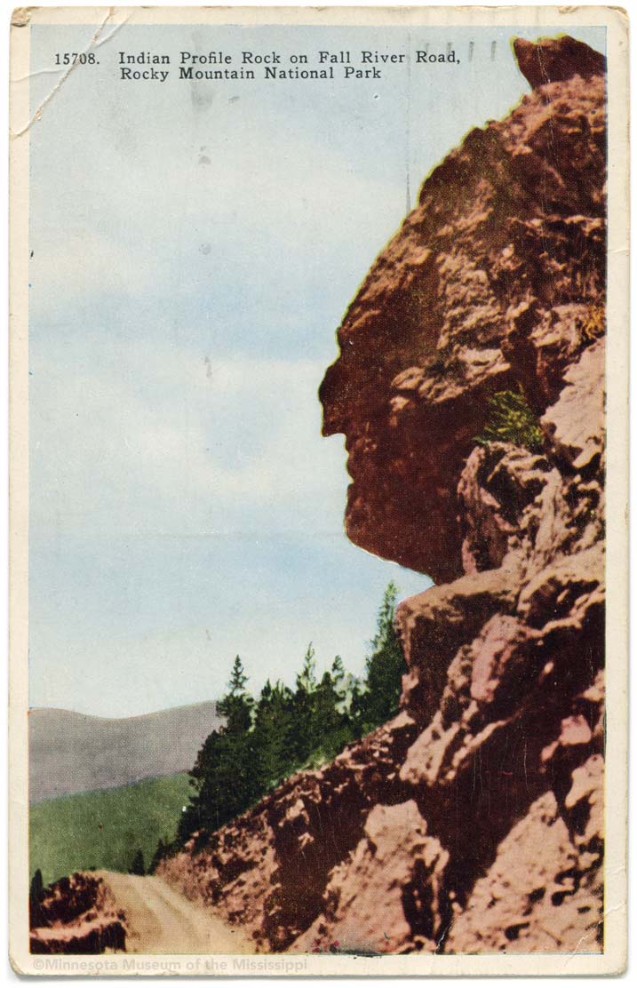 Obverse: 15708. Indian Profile Rock on Fall River Road, Rocky Mountain National Park Reverse: INDIAN PROFILE ROCK Publisher: Curt Teich / American Art Post Card Co. MNM#01-01137 Profile of a face with "feathers" standing upright above, accidentally created around 1918-1920 by workers dynamiting an outcrop for the one-lane Fall River Road from Milner Pass down to Grand Lake. About a decade later, the current Trail Ridge Road was built higher above the outcrop. Apparently the profile still exists overlooking the old roadbed a mile south of Poudre Lake, or about halfway between Fairview Curve and Milner Pass.