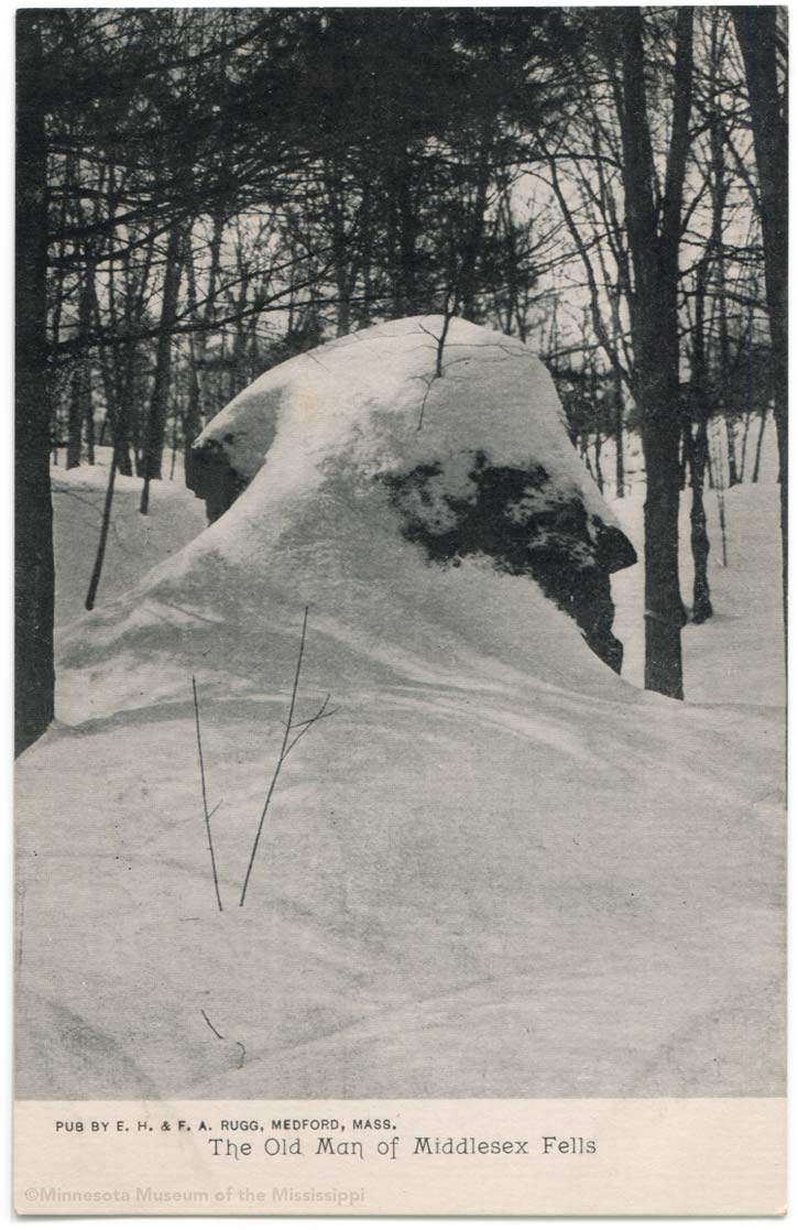 Obverse: The Old Man of Middlesex Fells Publisher: E.H. & F.A. Rugg, Medford, Mass. MNM#01-01260 This boulder profile was located in the forest of the Middlesex Fells Reservation near the junction of Fellsway and Parkway Road. It may have been displaced or destroyed by construction of Interstate 93. |