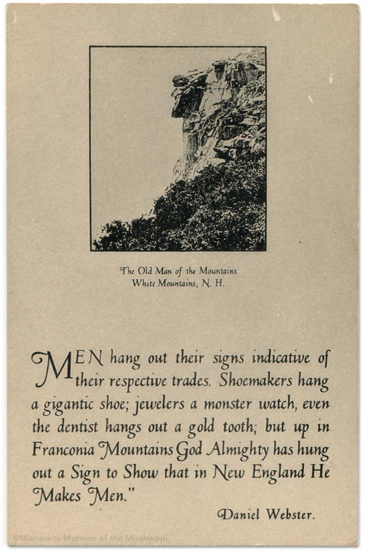 Obverse: The Old Man of the Mountains Publisher: The Meriden Gravure Co.- Meriden, Conn. MNM#01-01083 The most famous of all rock faces, which sadly collapsed on May 3, 2005. Popularized by Nathaniel Hawthorne in his short story "The Great Stone Face." It is New Hampshire's state symbol, reproduced on quarters, licensce plates, stamps, decorative china, and hundreds of postcards. Trail directions at www.gorp.com. Other views of this formation: |