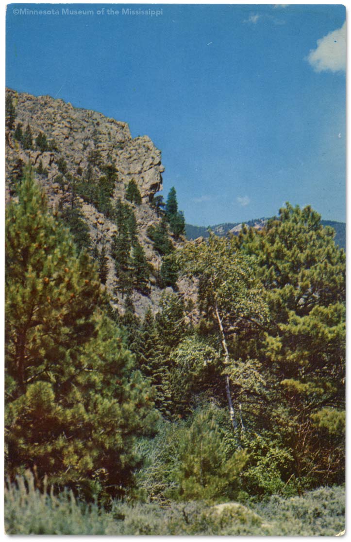 PROFILE ROCK, nicknamed the "Old Man's Face" by the pioneers of valley. Located 43 miles up Poudre Cañon on State Highway No. 14, from Fort Collins, Colorado.