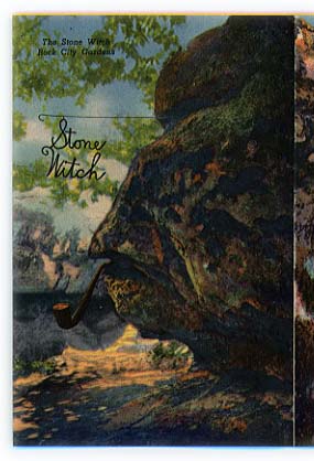 Among the points of interest along the Trail are the Grand Corridor--a passage-way 300 feet long and 10 to 20 feet wide, deep down between two high bluffs--Needle's Eye, Mushroom Rock, Gnome's Overpass, Goblin's Underpass, Lion's Den, Shelter Rock, across Sky Bridge to Lovers' Leap--(the view from which is unsurpassed)--Tortoise Shell Rock, and we wiggle through Fat Man's Squeeze, thence to the wonderful 1000-ton Balance Rock, Observation Point, from which one sees mysterious High Falls as it plunges 90 feet over the precipice, and the Hall-of-the-Mountain-King. At the Moonshine Still, in a natural grotto, the jolly gnomes "brew the mountain dew." Near the end of the Magic Valley, Galoochee, the wicked Stone Witch "smokes her pipe and smiles."