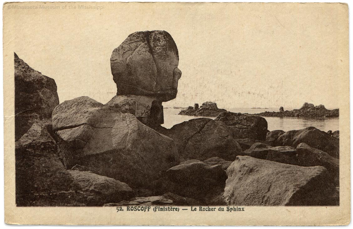 One of many unusual rock formations on the Brittany's "Pink Granite Coast." Unclear if this is the same rock which is nowadays known as Sphinx Rock.