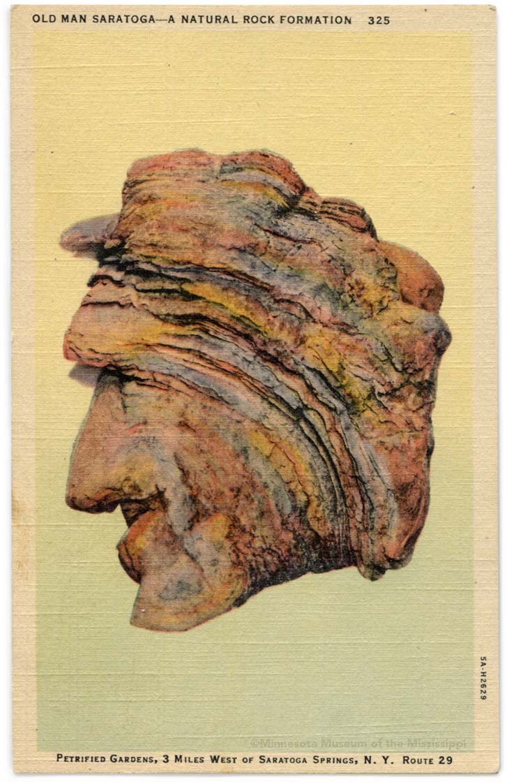 Obverse: Old Man Saratoga – A Natural Stone Formation Reverse: This is one of the many odd natural formations found at the Petrified Gardens. They are composed of primitive plants entombed millions of years in stone. Their scientific name is Cryptozoon, or sometimes called "Stone Cabbage." Visitors may spend hours studying these odd and beautiful formations in this park of 30 acres equipped with tables, fireplaces and picnic facilities. Publisher: C.W. Hughes & Co / Curt Teich MNM#01-01250 Fossilized stromatolite eroded into the shape of a face. Was once part of the collection at Petrified Sea Gardens, a tourist attraction showcasing the exposed stromatolites here. The museum and gift shop were demolished in 2006, and the current location of the Old Man is unknown. |
