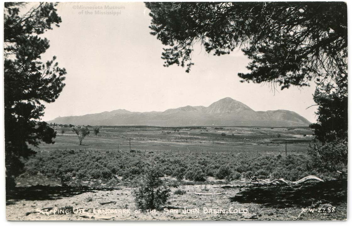 Obverse: Sleeping Ute, Landmark of the San Juan Basin, Colo. Publisher: Sanborn MNM#01-01166 Ute Mountains form this prone figure. Visible from Four Corners to the west, or Cortez and Mesa Verde to the east. Marble Mountain to the north forms the head, Ute Mountain in center the folded arms, Hermano Mtn the knees and two small outcrops as toes. |