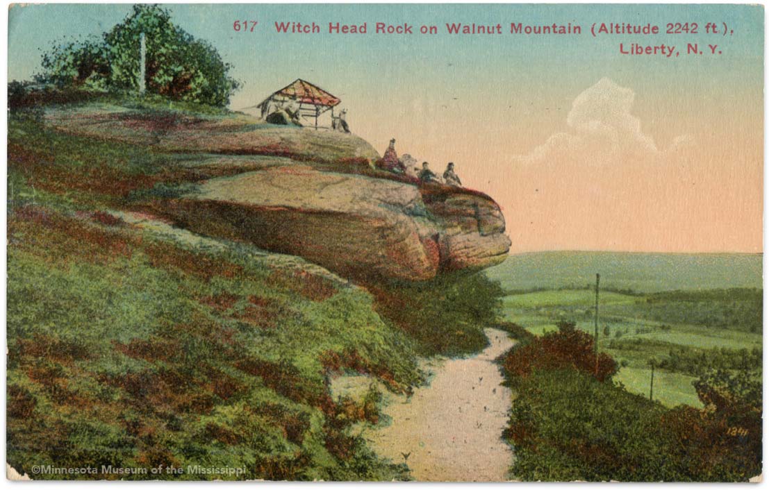 Obverse: Witch Head Rock on Walnut Mountain (Altitude 2242 ft.), Liberty, N.Y. Publisher: Art Postal Card Co., New York MNM#01-01204 Walnut Mountain Hotel once stood on summit to the left of postcard image. Since the 1960s the land has been a public park. Recently a local mountain bike club has restored the trail to Witch Head Rock. |