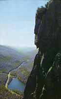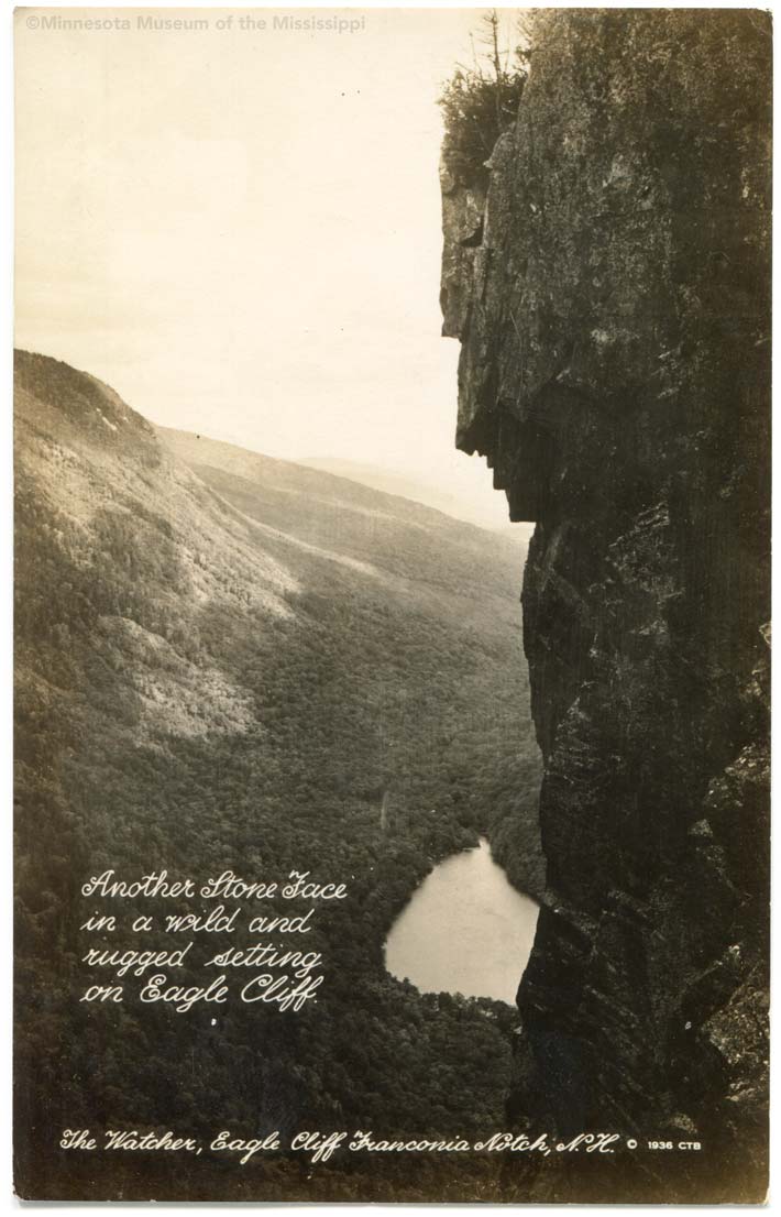 Obverse: Another Stone Face in a wild and rugged setting on Eagle Cliff. Reverse: The Watcher, Eagle Cliff, Franconia Notch, N.H. Publisher: C.T. Bodwell MNM#01-01185 Another face in competition with the popular Old Man of the Mountains. Trail directions at www.gorp.com. Other views of this formation: |