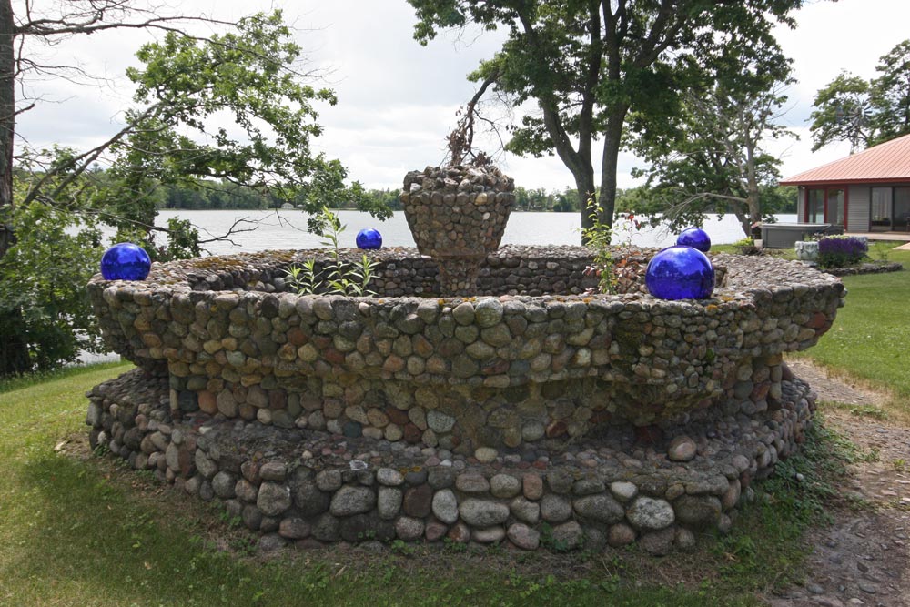 Hugo Vogt gathered many of the stones for his constructions from the North Shore of Lake Superior and the Iron Range, both places which are abundant in rocks, but are over 100 miles away. It must have taken many carloads or truckloads to bring the rocks to Ak-Sar-Ben. Hugo's cement and rock creations are built in sculptural shapes without any obvious 2-dimensional surface patterns. The only non-stone embellishements to the planters are occasional cast-concrete urns or glass gazing balls.