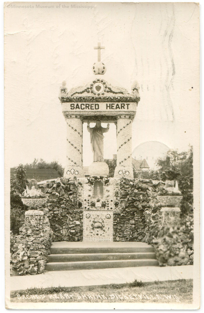 Farther down the road is another large construction, the Sacred Heart Shrine, completed in 1930. Here a statue of Jesus is nearly overwhelmed by the enormous concrete columns covered in white quartz with spirals of colored glass and sandstone shifter knobs. A smaller niche at the base allows visitors some opportunity to come closer to the shrine, which otherwise rises too high on its pedestal for close examination.