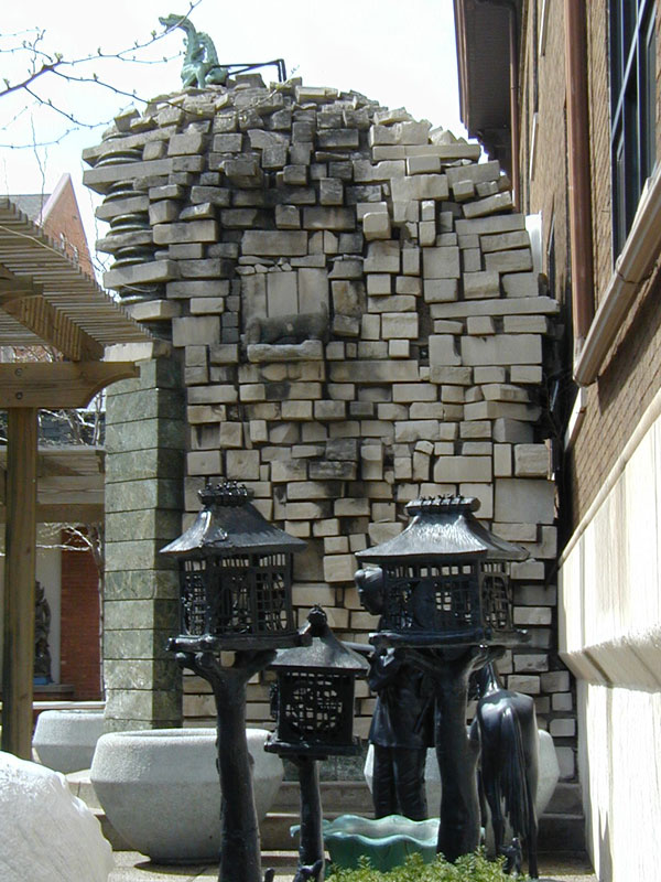 Though it is impossible to see from outside the gate, the ancient Wishing Buddha is still there today. Inside the shelter is a 1100-year old Japanese bronze buddha, at 10 feet high and 3-tons one of the largest buddhas in the U.S. One story about its purchase says that when B.J. purchased the statue in 1927 the Japanese government attempted to block its removal. B.J. persuaded the officials by assuring them that the statue would be given proper respect, and indeed for many years incense was burned 24 hours a day in its honor, perhaps up until the garden was dismantled.