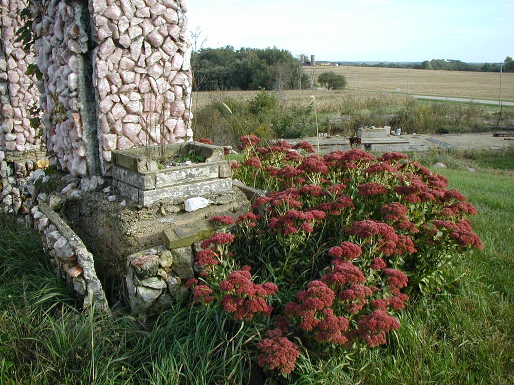 Just inside the front gate is an unusual natural rock with strangely eroded seams. William Notzke must have thought this boulder intriguing enough to place it in this prominent place at the head of the triangular garden. The rock planter which appears in the 1959 postcard no longer stands, but a square pedestal to the right of the boulder is a newer addition. The pedestal appears to be a donation box, with a plexiglass top and slot to insert bills or coins.