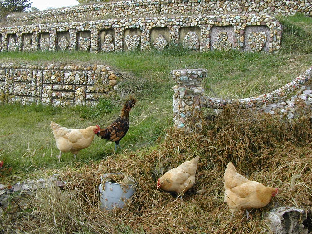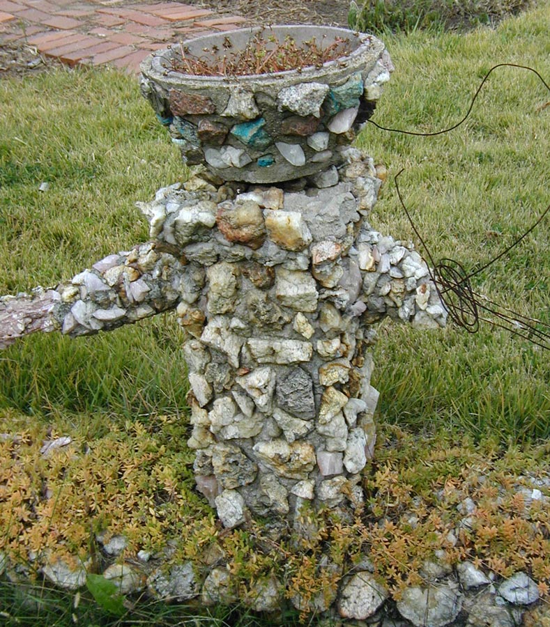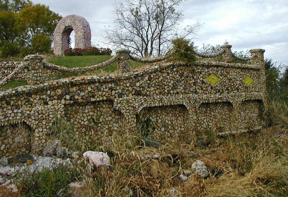 The walls are carefully constructed and embedded with colorful rocks and occasional lumps of colored glass. In the geometric patterns of the first tier it appears that small rocks were chosen to fit around larger ones to fill out the rectangular shapes precisely.