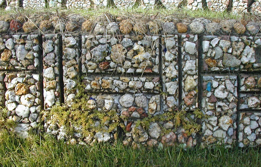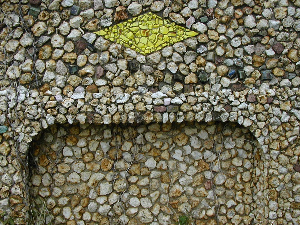 The high walls are visually broken up by square inset panels with rocks carefully placed around the edges. Above these are several diamonds made of colored glass shards.