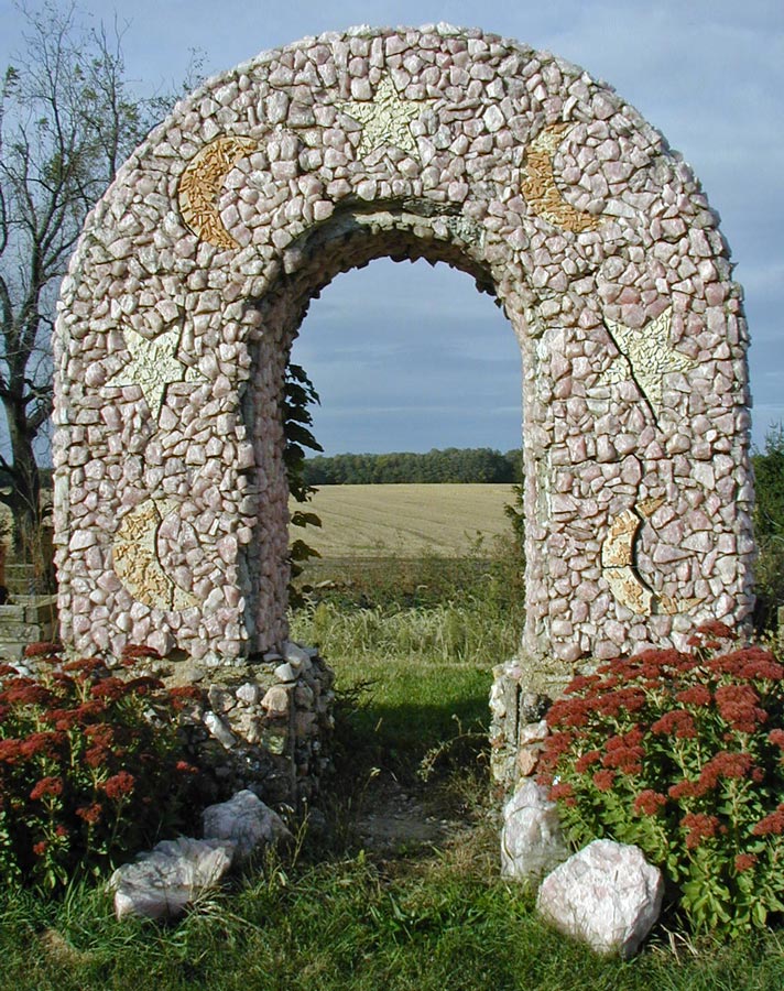 A sturdy rainbow arch decorated with moons and stars crowns the hill. The plain decoration and proportions are quite similar to an arched gateway at Rockome Gardens. Could one have inspired the other? This arch is encrusted with pink quartz and decorated with moons and stars.