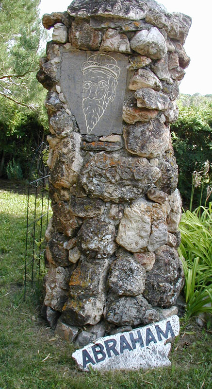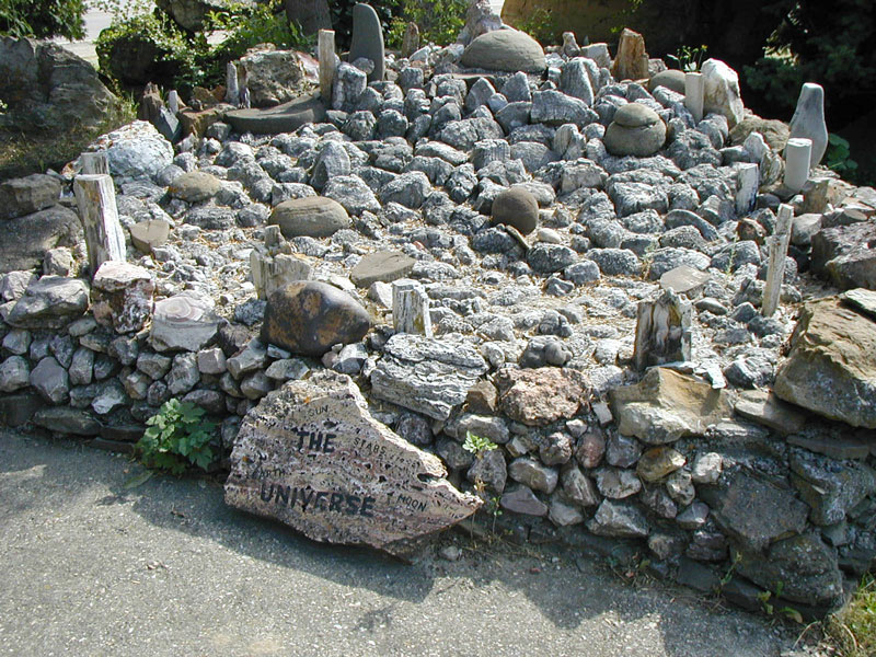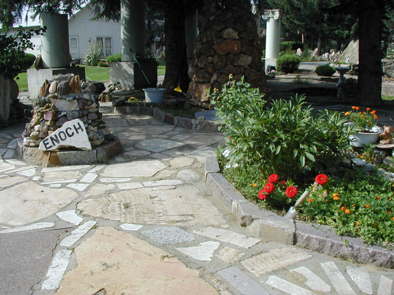 A sidewalk leads us on past a pair of pillars and a rough tower labeled "Tree of Knowldege" to a flagstone plaza. Back toward the lawn, a tall rock pillar represents Adam & Eve and a small pile symbolizes Enoch, who was taken into heaven without dying.
