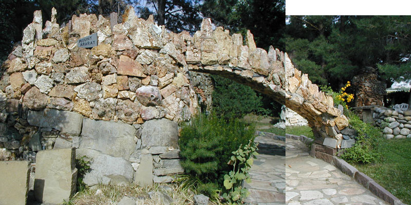 The massive bulk of Mount Ararat dominates the east side of the plaza. Duck under the buttress representing the rainbow to see a small rock engraved "Noah" at its base. Perhaps the upright stones represent the animals crossing two-by-two to the crowded dry land of Mount Ararat?