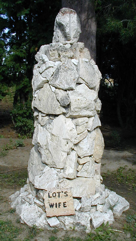 Numerous towers of rock are arrayed around the edges of the plaza. The Tree of Knowledge and the Oak of Mamre are placed on opposite ends, and in between, Lot's Wife is suggested with white limestone chunks in human form. The three patriarchs are less figurative but feature etched faces and signs identifying Abraham, Isaac and Jacob.