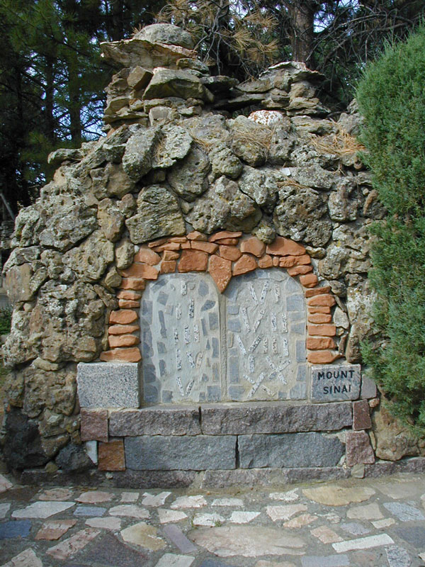 Behind Mount Ararat, a smaller monolith represents Mount Ararat with the Ten Commandments shown as roman numerals of lighter granite set in cement.