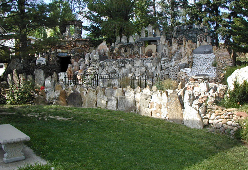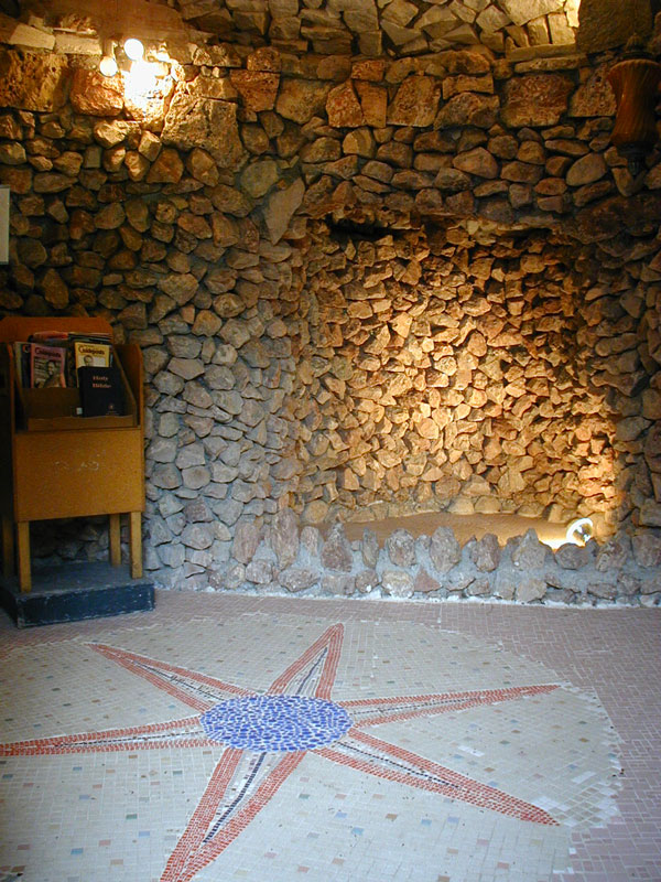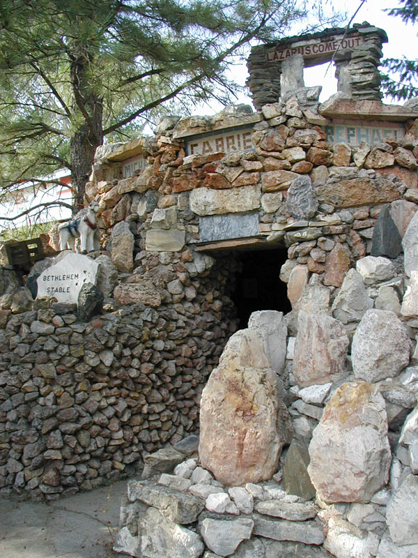 Inside the cave of the stable, we see a crude mosaic star representing the star of Bethlehem and a fantastic domed grotto ceiling of crystaline rocks. This most impressive engineering feat in the garden was reportedly accomplished by bracing the dome with telephone poles while the cement set. In the corner are stone cast ox and ass lowing at a simple stone manger, which the guidebook proudly points out, contains a few strands of straw brought from Italy. In another corner there are copies of Guideposts and the visitor guest book.