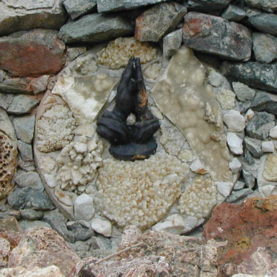 This photo makes clear some of the construction methods used to build the rock garden. It seems that in areas of detail, Adolph cast the smaller stones in a round mold, probably flat on the ground. When this hardened, the roundel was set in one piece among the rougher, larger rock masonry. This technique is visible in many other places in the garden such as the Egypt mosaic and the Alpha & Omega tableau.