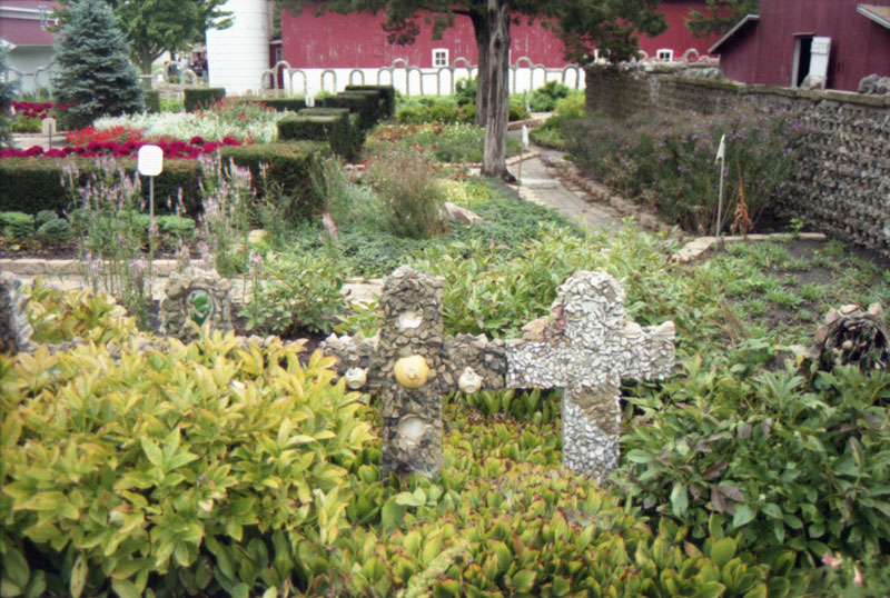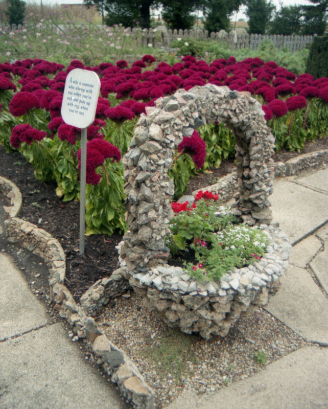 Elvan Yoder, who bought the property in 1958, added placards with Amish aphorisms to the Sunken Gardens. These alternate between folksy proverbs and sentimental verses about gardening: