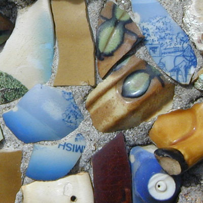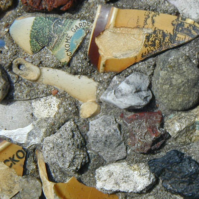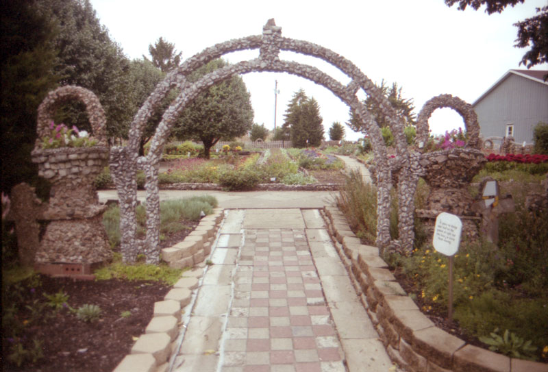 Most of the walls at Rockome are decorated only with crushed rock, but in the corner of the Sunken Gardens are some walls decorated with colorful broken pottery. These walls must be more recent because they are embedded with broken souvenirs from Rockome Gardens! A curious bit of self-reflective rock garden tourism.