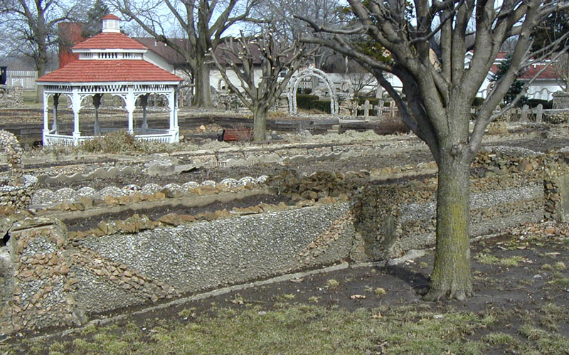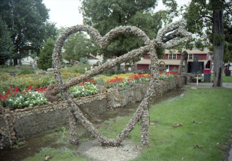 The photo from 2000 above shows that extra rock supports were added to the sides of the heart, perhaps after too many visitors leaned on the thin sculpture while posing like the woman on the postcard. Part of the charm of this sculpture is its fragility, despite its heavy rock and concrete materials. In the nearly four decades between the postcard view and photo above, the trees in the background have grown to block the open view of the farm fields surrounding the garden.