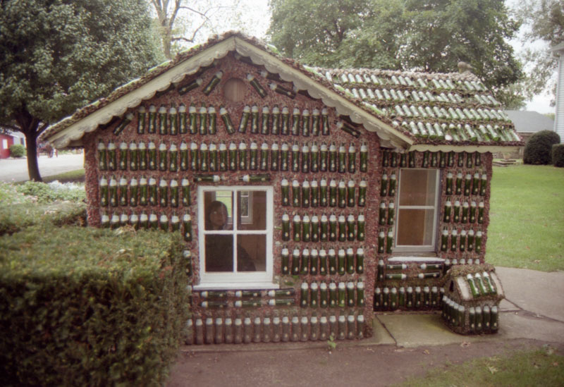Adults had to stoop to enter the low building, like a child's playhouse. It was furnished with child-sized chairs and a small table. The house was originally surrounded by a foot-high concrete wall embedded with more bottles, but this was gone by time of the photo from 2000 above.