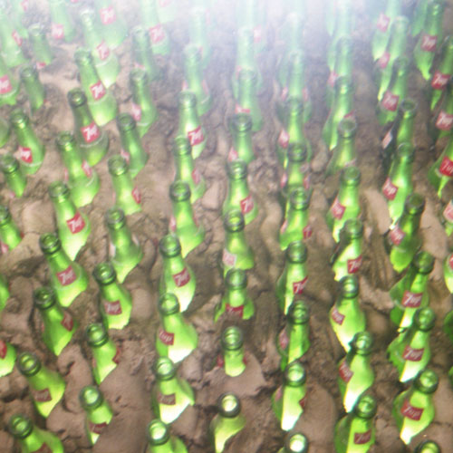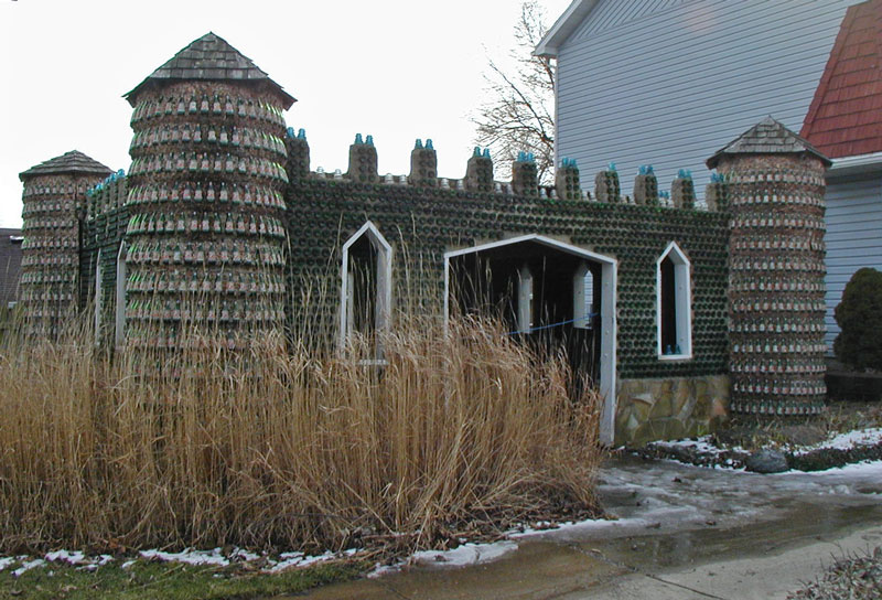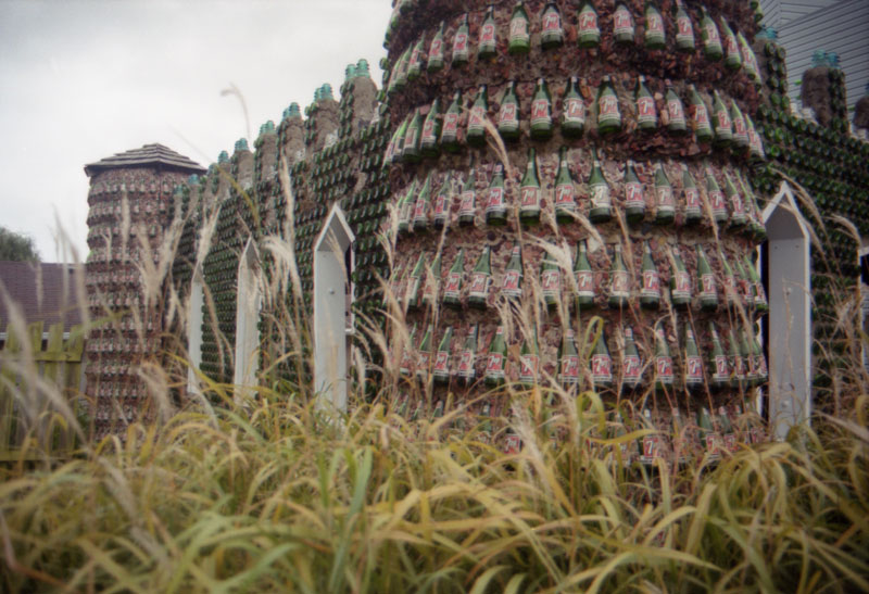 The Bottle Castle is a square structure made from nearly 8,000 12 oz. green 7-Up bottles. The castle was built in 1987-88 as the entryway to the new Haunted Cave attraction, decades later than the two bottle houses.