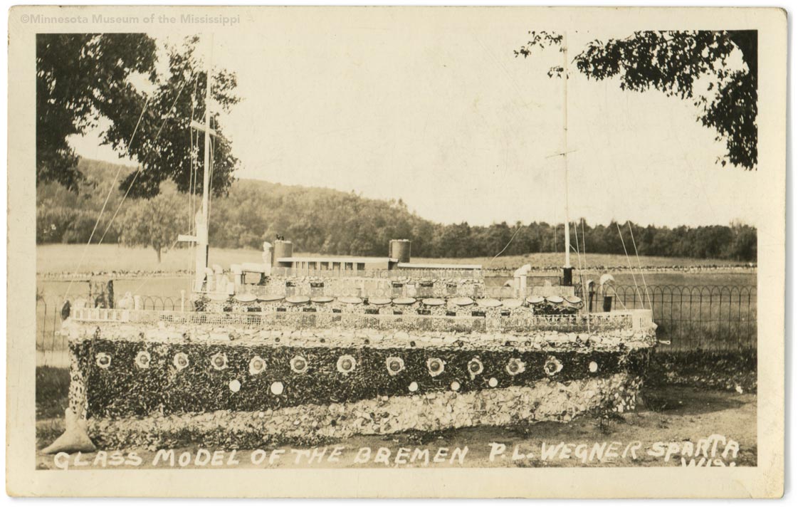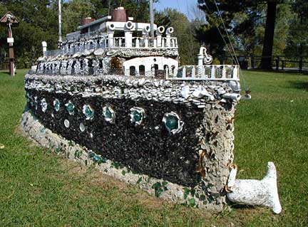 The glass model of the Bremen depicts the ship on which the Wegners emigrated to America from Germany in 1886. This was one of their first large concrete projects, completed in 1930. The model is made of concrete covered with broken glass and seashells, with glass insulators for portholes, even a concrete anchor on a chain. Above deck there are numerous small details, with air funnels and radio masts made from pipes, and even some tiny glass passengers inside the cabins.